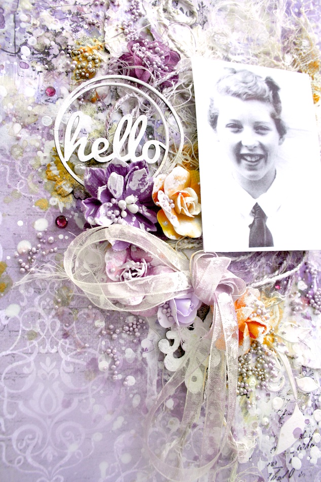 Once my background was done I added the pretty heart chipboard piece, and then layered on my photos, some flowers, lace, and then lastly some tiny shells that I adhered with clear gel medium.