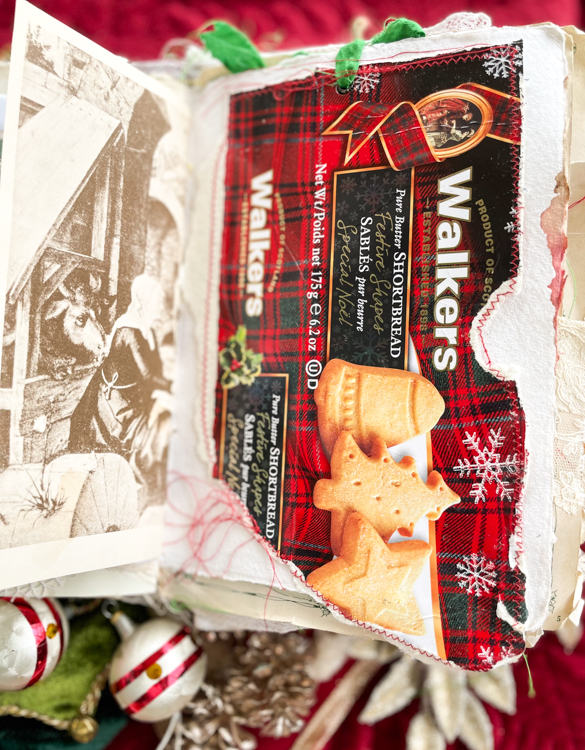 I had so many lovely materials to work with to work with, I even had saved some candy wrappers from my favourite sweets, and they made cute little frames. Be creative and think about all the little bits of paper wrapping or packaging you can use, I added some gorgeous little vintage embroidered handkerchiefs, bits of lace to make pockets, pages from a vintage children's Christmas book, even the programme from our Candlelight church service. All these can tell your family Christmas story, your traditions, and what makes the season special to you.